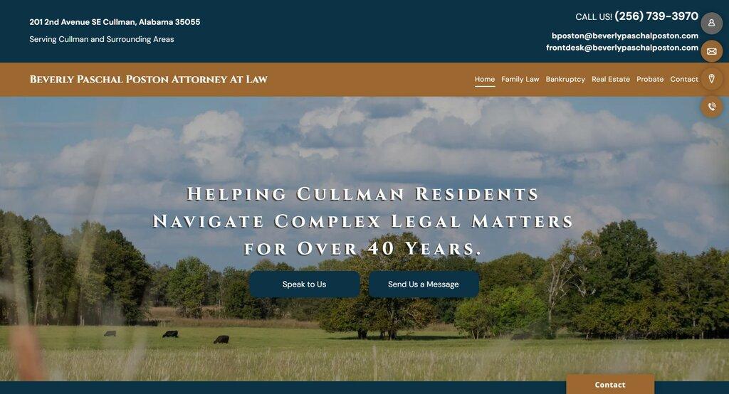 Beverly Paschal Poston Attorney At Law has been a trusted legal resource in Cullman, Alabama, since 1982, offering specialized services in family law, bankruptcy, real estate, and probate. With over 40 years of experience, the firm is dedicated to providing personalized consultations and clear guidance tailored to each client's unique legal needs.