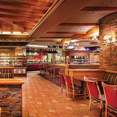 With its soaring, skylight ceilings, slate floors, timber beams, and massive floor-to-ceiling stone fireplaces, this two-story casino has a rustic elegance.