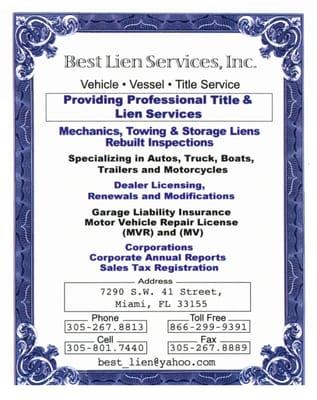 Best Lien Service Inc in Miami, FL, operates as an Auction Business licensed by the Florida Department of Business & Professional Regulation. Established in 2010, the company's license is current and active until November 2025. Situated at 7290 SW 41st Street, Miami, the business is recognized for its compliance with state regulations and standards.