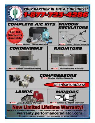 Performance Radiator offers a wide range of automotive components including radiators, condensers, air conditioning units, mirrors, headlights, and taillights. Their commitment to quality is reflected in their detailed warranty information, ensuring customer satisfaction on each order.