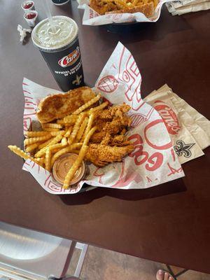 Canes use to be a favorite in our house but the size of the chicken is ridiculous. My step dad got his chicken without crust and the size of them look like chicken nuggets. For $15 he should have...