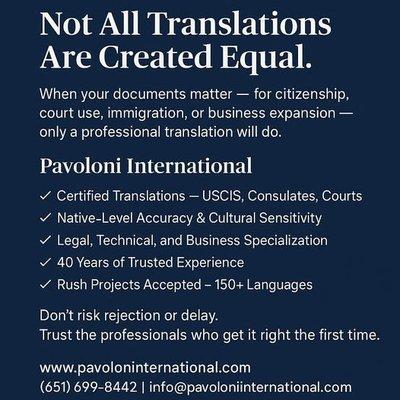 Welcome to Pavoloni International Translation and Interpreting Services! Since 1985, we have been providing quality service to our clients. We are confident that we will consistently meet and exceed your expectations by providing responsive service and customized translation solutions in many global languages and cultures. Call us today!