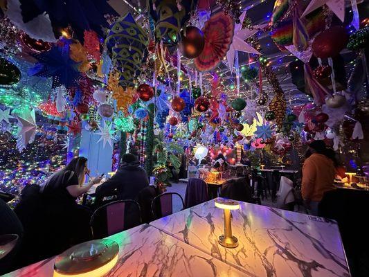 Festive and fun . The decor is Christmas on crack lol. Every inch of the ceiling is covered in lights, bulbs and Latin countries flags. Two levels of festivities with massive bars on each floor....