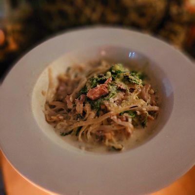 We were very late to our reservation and were still seated. The food was good. Service was alright. Our waitress did treat us to a round because they forgot to bring our second round of drinks....