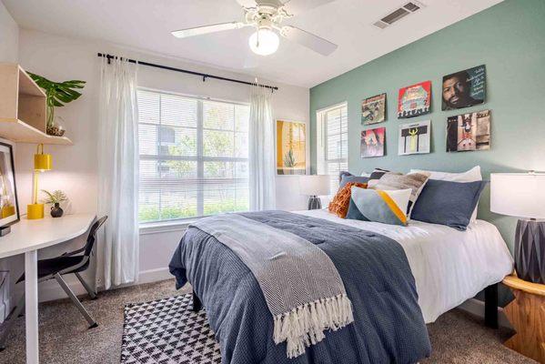 Welcome to Cabana Beach San Marcos, your destination for premium off-campus apartments near Texas State University. We offer open concept studio, 2, 3 and 4 bedroom apartments, all with private bedrooms and private bathrooms. Each fully furnished apartment includes a newly upgraded full kitchen with granite countertops and energy efficient appliances, an upgraded living room with a new modern furniture package and 55" TV, washer and dryer, and high speed internet access, and a private screened-in patio. We also offer upgraded features such as walk-in closets, pool views, and reserved covered parking.
