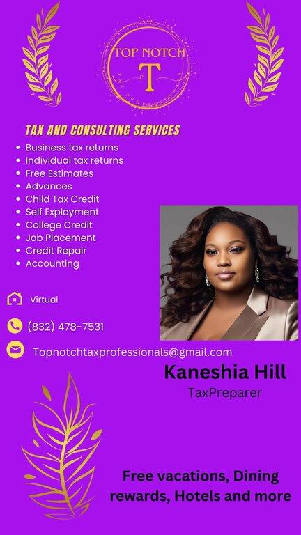 Kaneshia Hill is a certified public accountant and an Intuit TurboTax Verified Pro based in Houston, TX. With her expertise in tax preparation and financial guidance, she provides reliable services to individuals and businesses alike. Residents of Houston can count on her to deliver professional and personalized solutions to their accounting needs.
